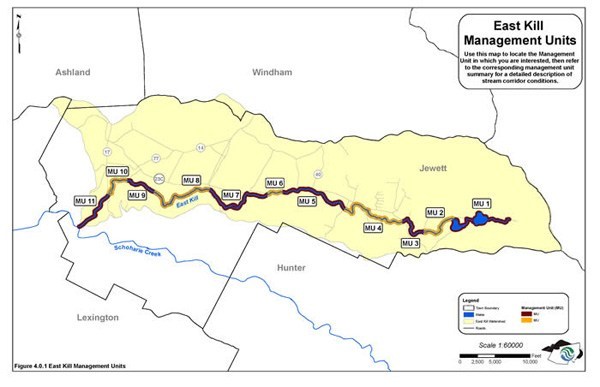 This section offers detailed descriptions and specific recommendations for approximately 16 miles East Kill, from the headwaters upstream from Colgate Lake in Jewett downstream to its confluence with the Schoharie Creek near the County Route 17/23A intersection. This section provides a useful reference for the extent of current problems at a localized stream reach scale, with specific recommendations for action and references to other sections of the plan where further information or resources can be found. The Creek’s main stem has been organized into eleven Management Units (MUs). Each MU summary outlines, historic conditions and disturbances, present stream conditions (its bed and banks), general streamside (riparian) vegetation condition, flood threats, aquatic habitat, and water quality. Summary tables at the beginning of each unit provide a condensed version of each expanded description, and companion maps show the location of specific features described in the text.